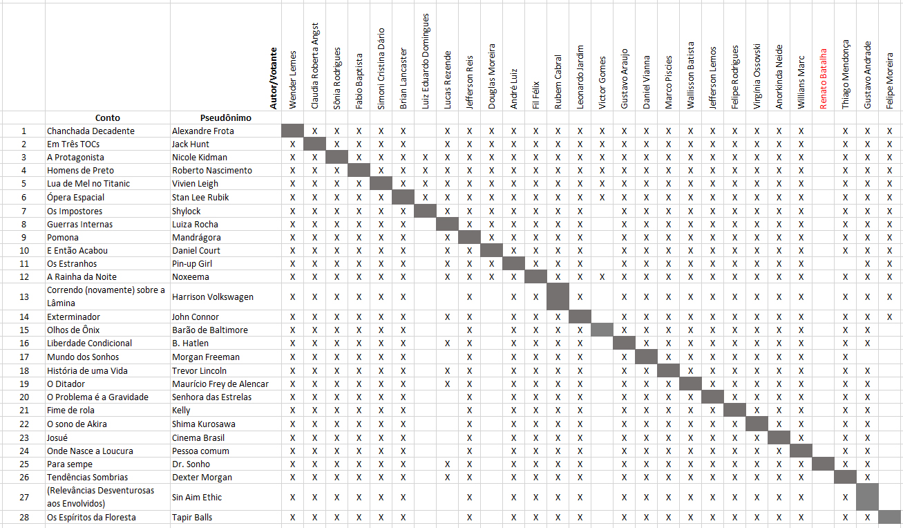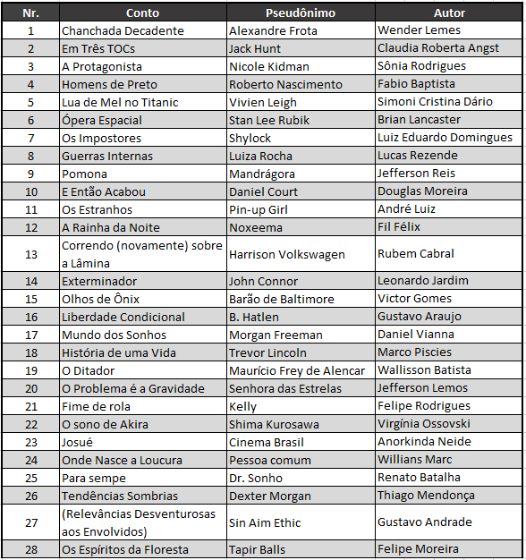 É de se reparar que dos 28 participantes, seis deixaram de cumprir o previsto no regulamento. Infelizmente, terão seus contos desclassificados e deletados, juntamente com os comentários recebidos.