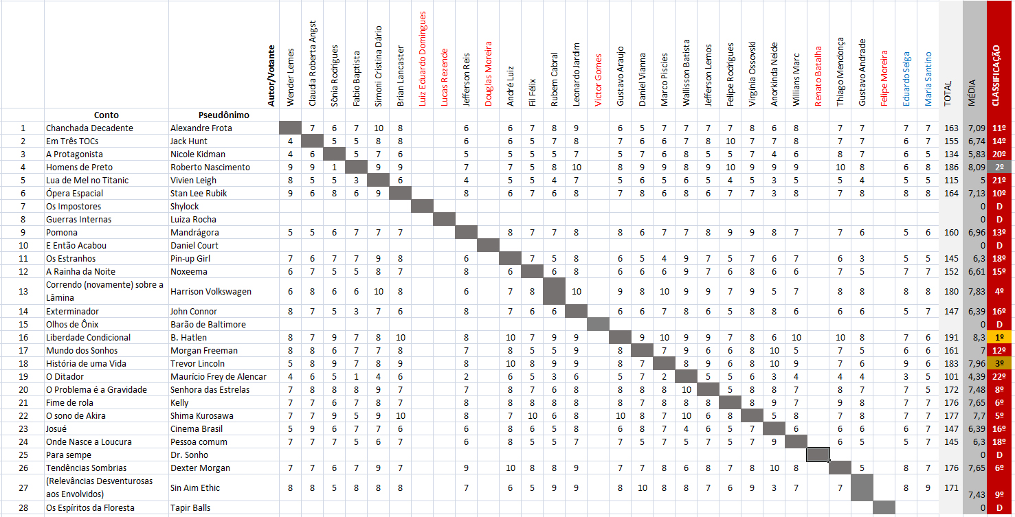 Prosseguindo, a tabela a seguir consolida as notas, com o total geral e a média obtida por conto. A classificação só foi definida com a postagem do último voto!