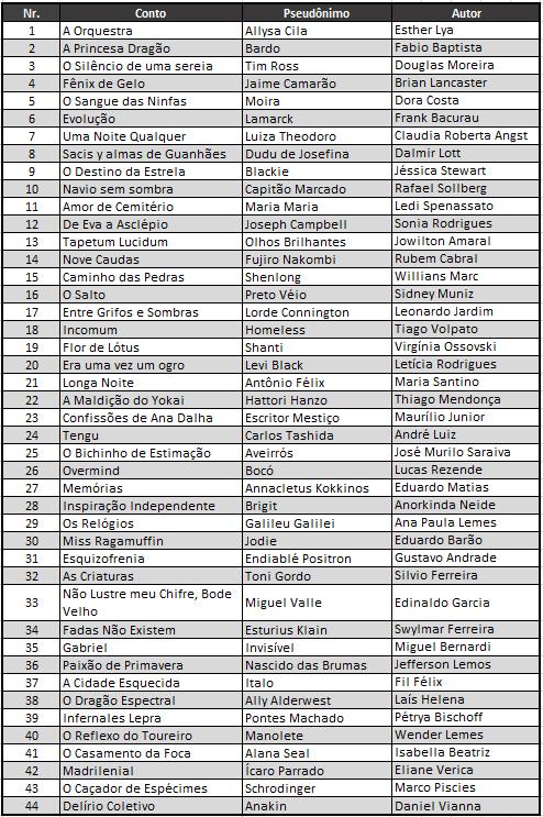 A lista abaixo contém os títulos dos textos inscritos, os pseudônimos e os nomes verdadeiros de cada participante: