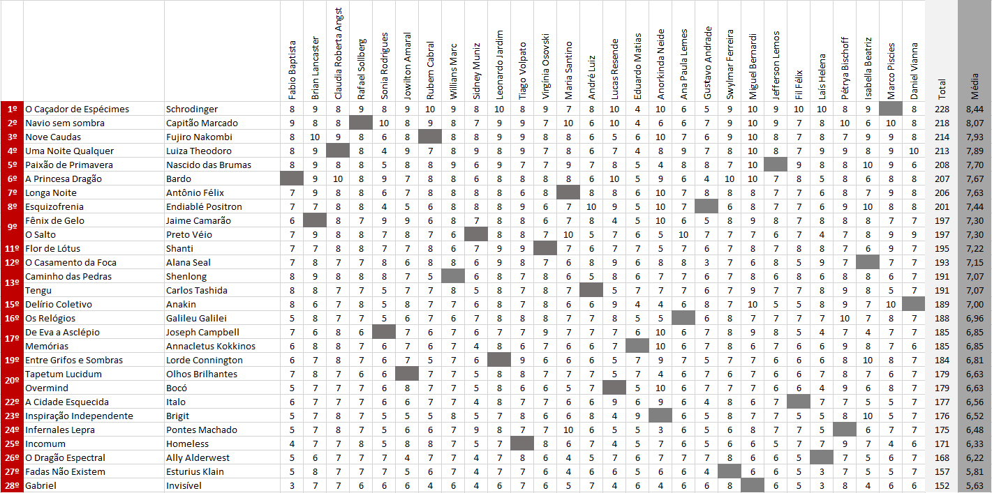 Resultado final corrigido: o conto “Paixão de Primavera (Nascido das Brumas)” teve uma nota contabilizada equivocadamente, a menor. Com a correção, a ordem de classificação se alterou, com o texto em questão passando do sexto para o quinto lugar. Agradecemos à Ana Paula Lemes pela observação atenta e pedimos desculpas ao Jefferson Lemos pelo erro.