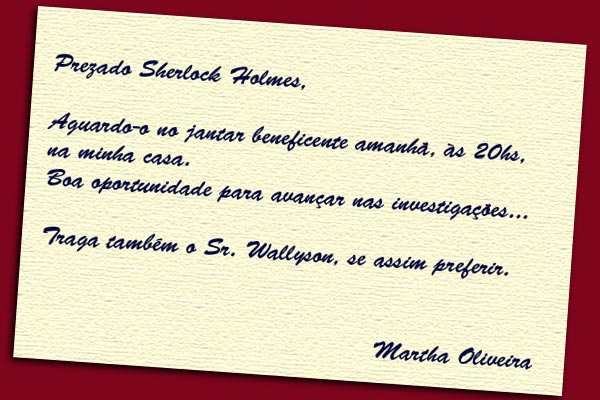 — Investigação de adultério, veja só que coincidência! Pouco antes de a senhora chegar, estava falando que esse é o meu tipo de caso preferido, não é mesmo, Watson? – Holmes parecia verdadeiramente animado. Pousou o cachimbo no criado mudo e aproximou-se de Martha Oliveira. – A senhora teria uma foto recente do seu marido?