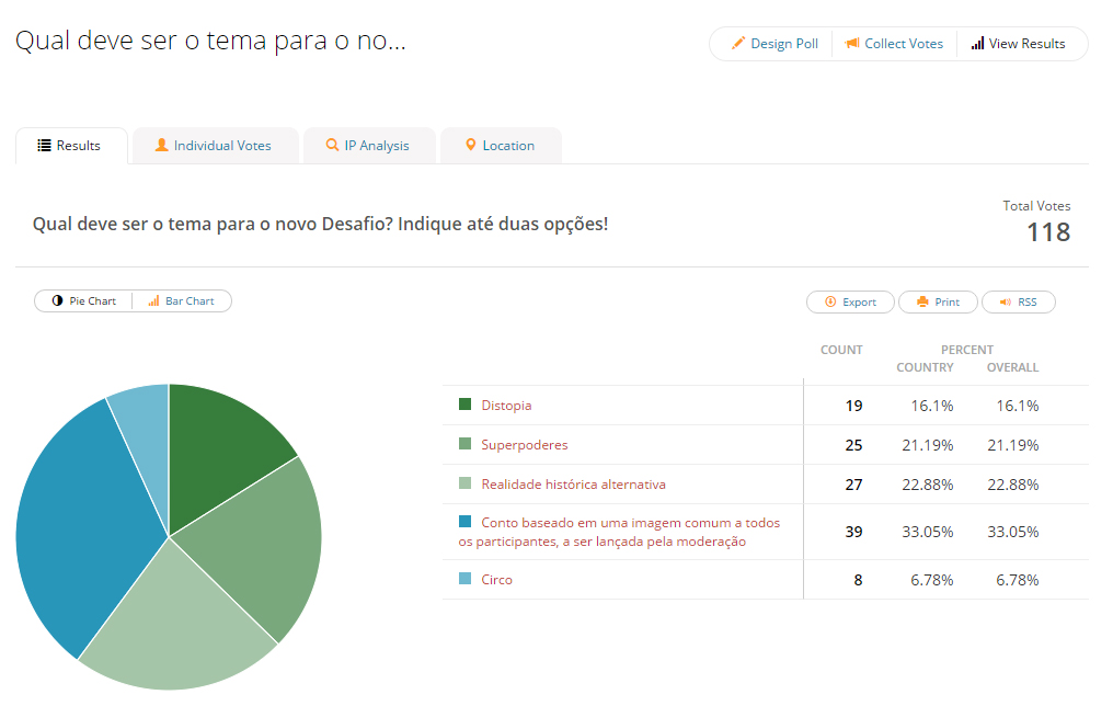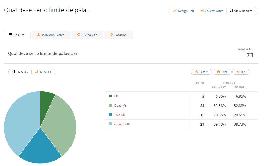 Para o limite de palavras, procuramos adotar uma média ponderada, levando em conta o percentual de votos para cada opção. Sendo assim, o limite para o desafio será de 2900 (duas mil e novecentas) palavras.