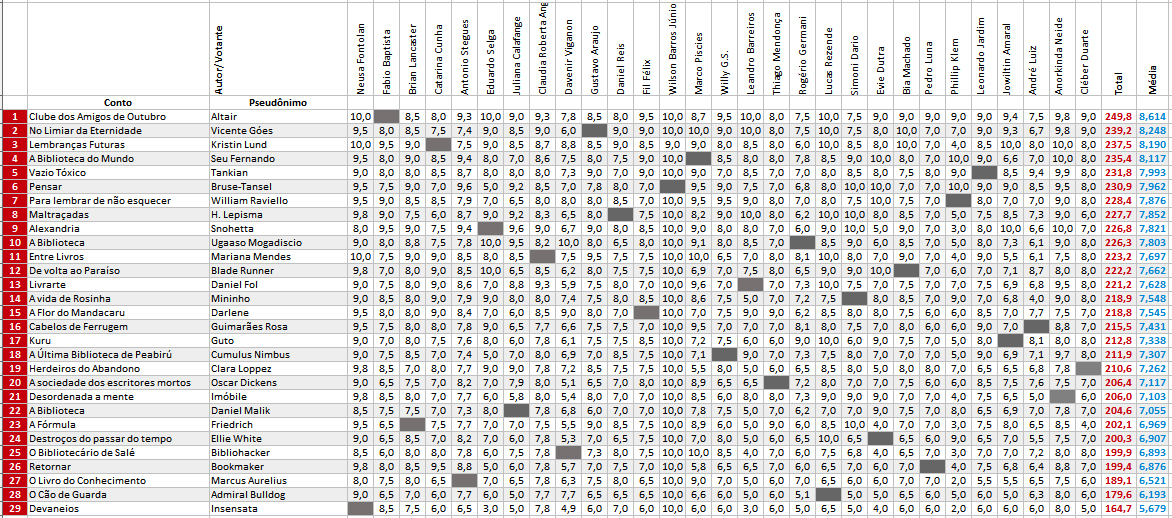 Abaixo vê-se a pontuação final, já desconsiderados os contos eliminados.
