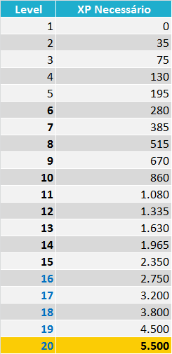Aqui está a tabela de progressão de XP, informando o quanto é necessário para chegar ao próximo nível. Boa diversão! 😀