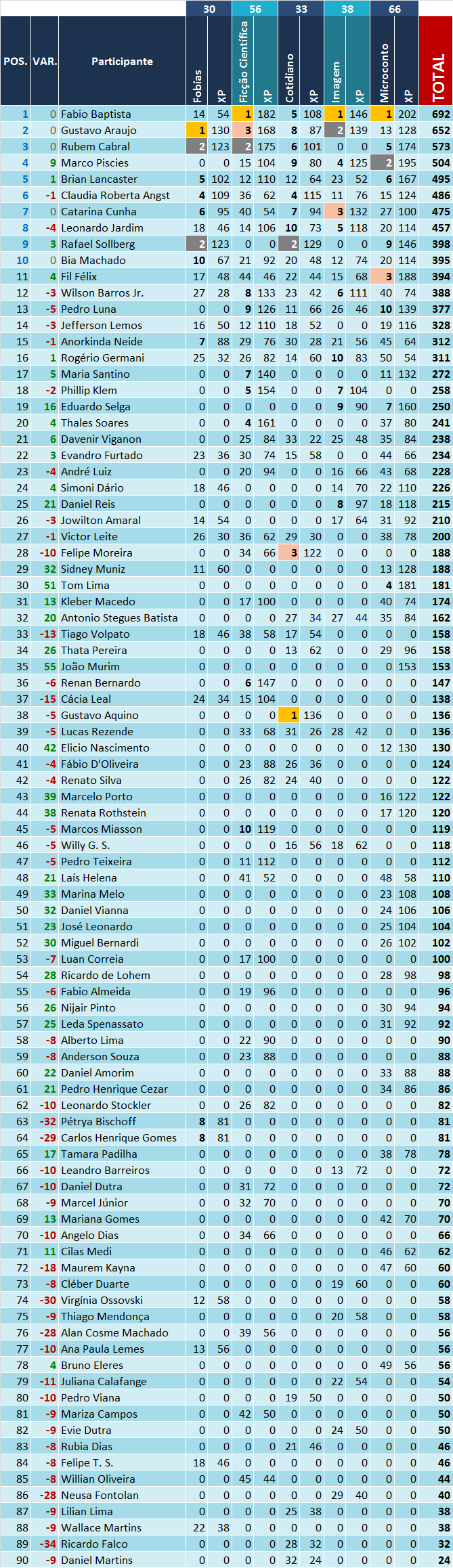 Por último, o “Ranking Geral“, que contabiliza todos os pontos dos 197 escritores e escritoras que já passaram por aqui ao longo de dezenove desafios. Agora esse ranking contém elementos de RPG e os escritores podem “subir de nível” de acordo com a pontuação alcançada, confiram: