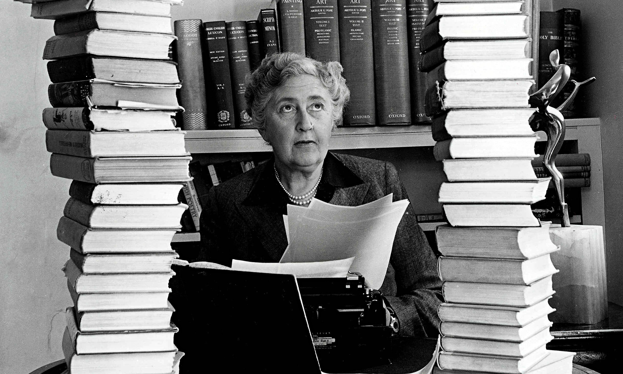 Agatha Christie, surrounded by some of her 80-plus crime novels.