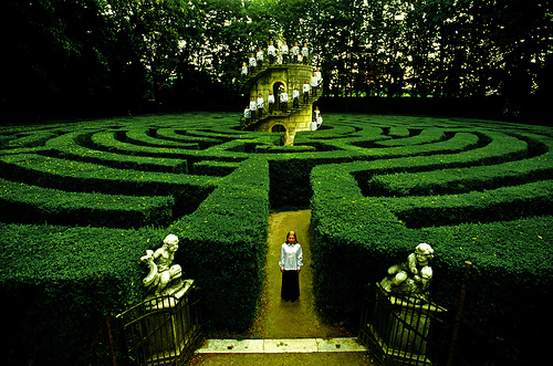 Olho para os lados, só vejo paredes de arbustos. Olho para cima, bem distante brilha uma lua enorme. Olho para baixo, pétalas de rosas brancas por toda a passagem.
