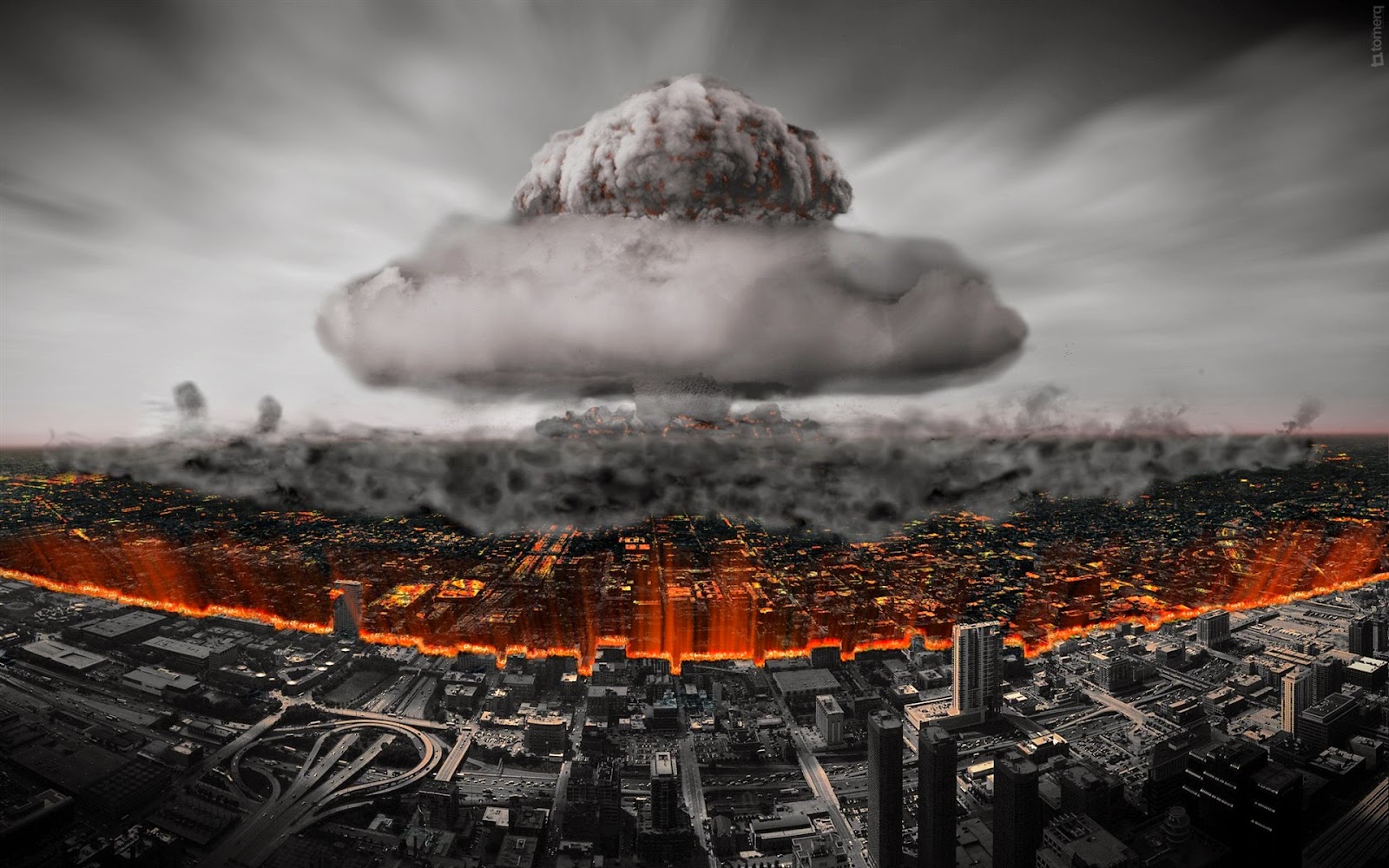 E ali, sentindo as maiores dores que já senti, com o braço quebrado, o pé esquerdo virado para o lado errado, com as roupas esfarrapadas, jogado numa pilha de entulho e cadáveres, olhei para cima e vi, erguendo-se imponente no céu, lá pelos lados da Praça da Sé, um improvável cogumelo atômico.