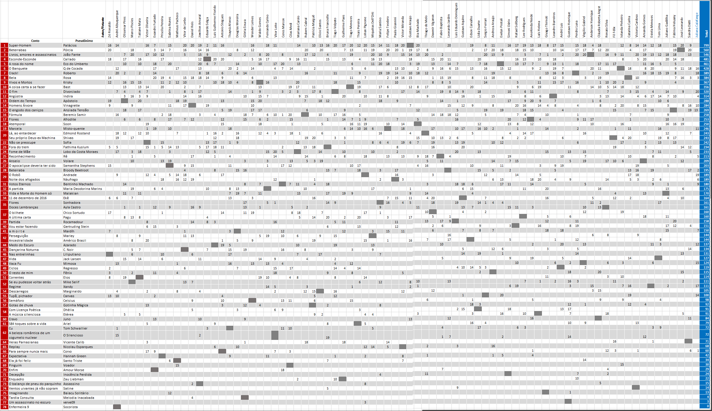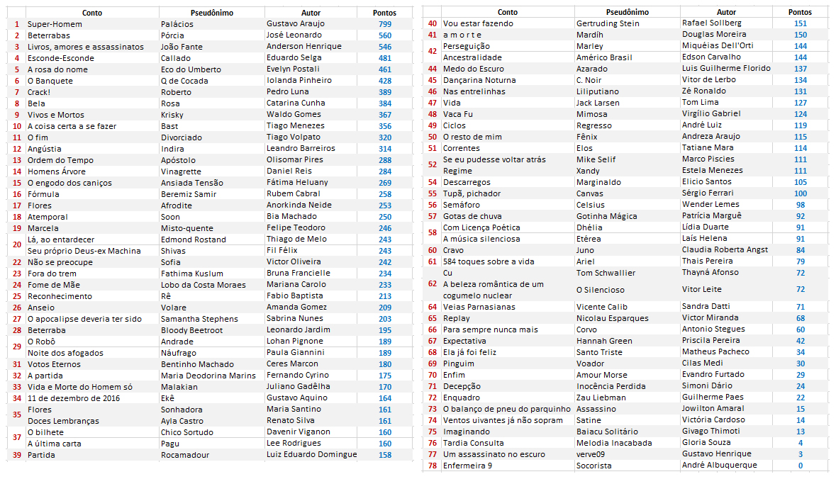 No total, foram 78 os contos finalistas, isto é, aqueles cujos autores cumpriram integralmente as regras relativas aos comentários e à votação. A tabela abaixo demonstra pontuação final, nota a nota, já desconsiderados os contos eliminados.