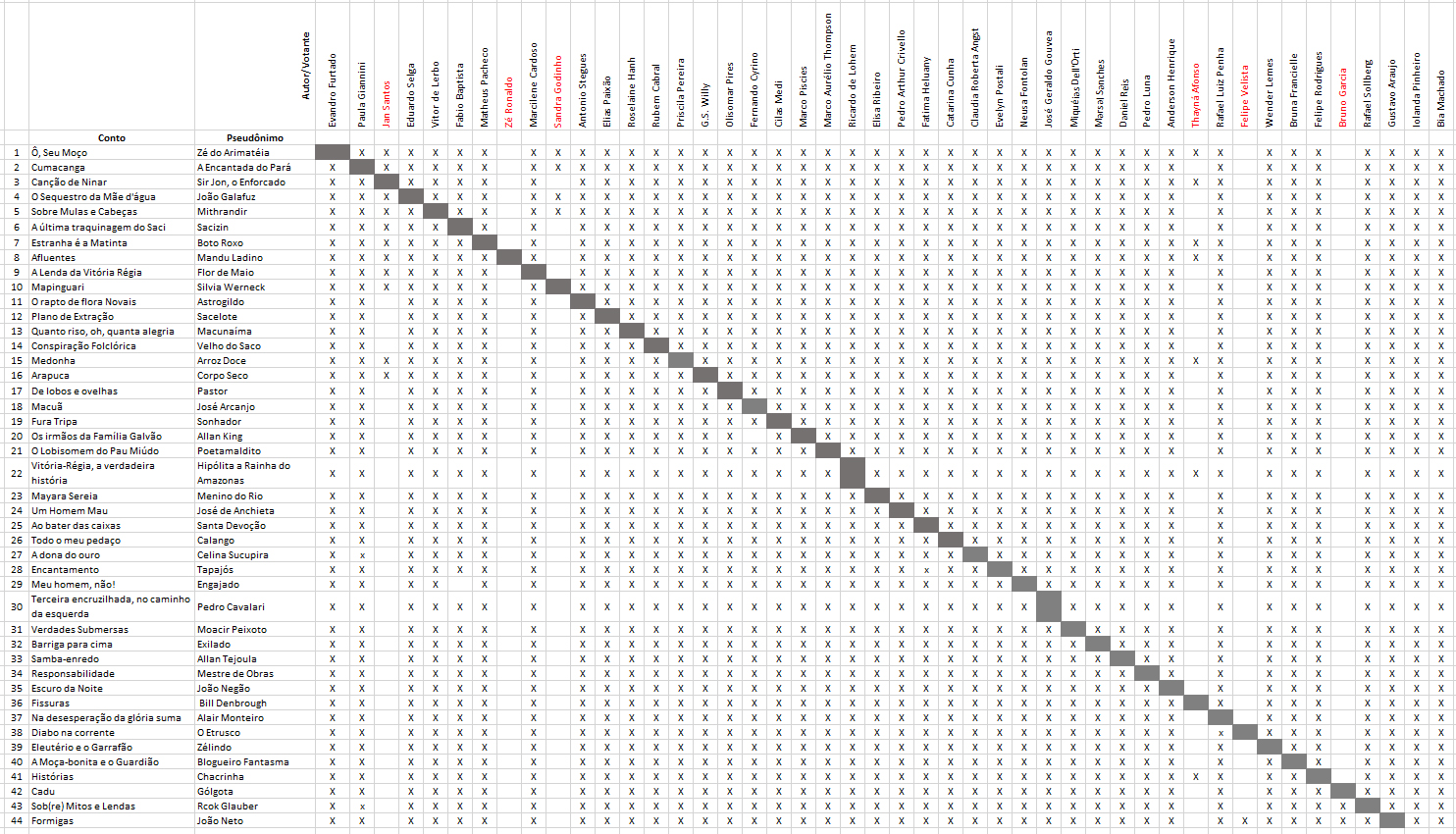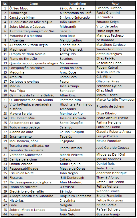 A tabela abaixo contém os títulos dos contos, os pseudônimos e os nomes verdadeiros de cada participante: