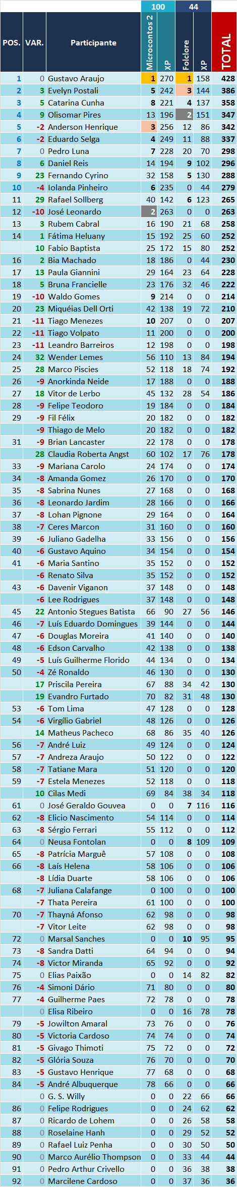 Em seguida, nosso já tradicional Ranking do RPG (ou Ranking do XP) que soma os pontos obtidos pelos quase 300 escritores e escritoras que já passaram pelo Entrecontos ao longo de 26 certames.