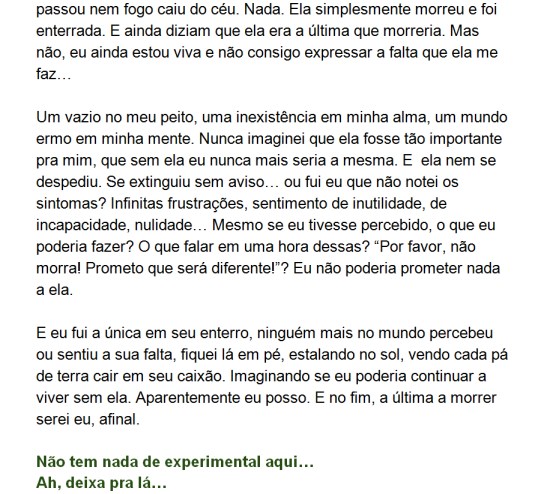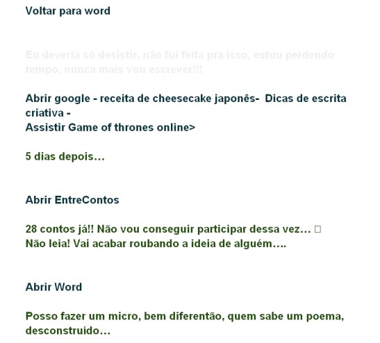 O experimento aqui foi muito feliz. Conseguiu produzir vários pequenos textos sofríveis, mas que a autocrítica invejável fez grande diferença. Logo o conteúdo perdeu totalmente a importância diante do autoflagelo da autora.