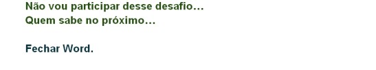 Taí uma bela ideia para quem não consegue atingir um objetivo, (desafio). Dizendo que não faz, mas o não fazer é o que já esta feito. Em verdade este desafio foi uma moleza mesmo… Ks…Ks…Ks…, o não fazer é o mesmo que ter feito, este “conto” (trabalho) tá aqui para provar que o tudo é nada, e o nada é o tudo. Bela saída, belo drible no zagueiro brutamontes, faz que vai, mas não vai, Emperra para dizer que fica, mas vai. E foi