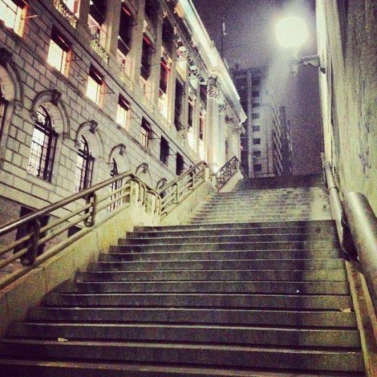 Interessante como o mendigo fazia parte da paisagem. Aquele homem fazia parte daquele lugar. Não consigo me lembrar da escada sem a presença dele, lá, no alto. Reparava que sempre colocava as muletas perfiladas junto ao muro, de maneira a não atrapalhar os transeuntes. Eu não sabia como ele chegava até ali, não sabia onde morava, não sabia como se alimentava… Eu o cumprimentava na ida e na volta, nunca deixei de dizer bom dia e boa noite. Isso mesmo, boa noite! Quando passava por ali, na volta do trabalho, mesmo com a noite chegando, o homem continuava lá, no mesmo lugar.