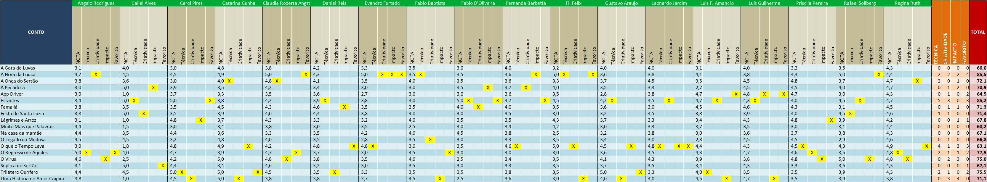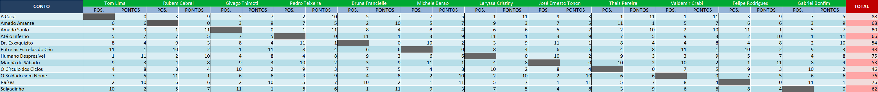 Agradecemos a todos pela participação e empenho. Dessa vez, apesar de alguns votos de última hora sem o devido capricho, não tivemos nenhuma desistência, o que é muito gratificante.