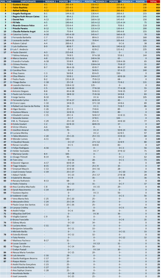 Lembramos a todos que no decorrer do próximo ano os primeiros colocados receberão suas medalhas conforme previsto no regulamento. E o campeão Gustavo Araujo receberá o troféu do Lendário Javali! Em breve a moderação entrará em contato para pegar os endereços de envio.