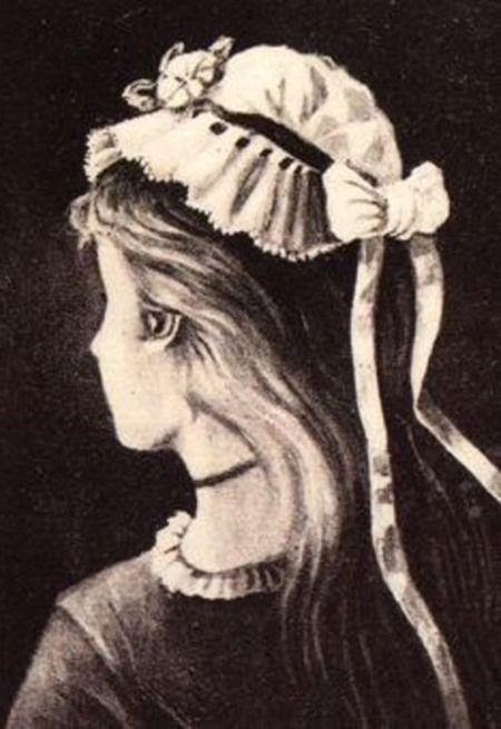 A imagem escolhida é fantástica. É possível enxergar o perfil de uma moça de cabelos longos e, dependendo da perspectiva, o perfil de uma bruxa.