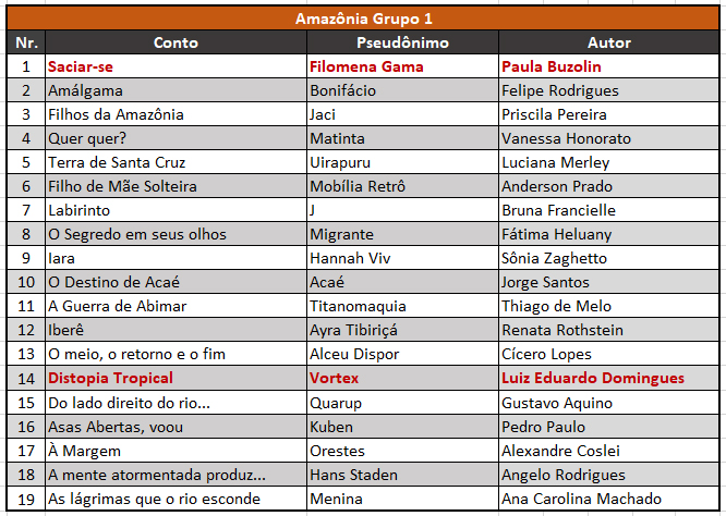 Conforme previsto no regulamento, os participantes foram divididos em dois grupos. As autorias são reveladas conforme as tabelas abaixo: