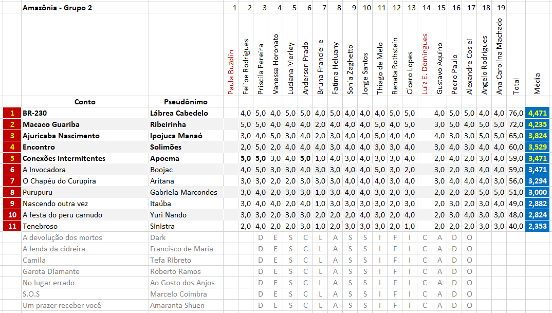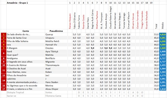 As tabelas abaixo demonstram as notas, já desconsiderando os contos desclassificados. De acordo com o previsto, os cinco primeiros de cada grupo passaram à fase final.