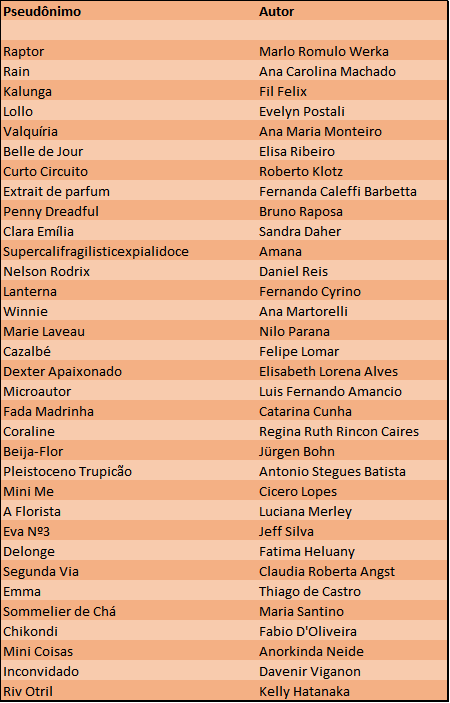 Agora é o momento de conhecer os nomes dos nossos aventureiros. Abaixo uma tabela com as reais identidades por trás dos pseudônimos utilizados no desafio.