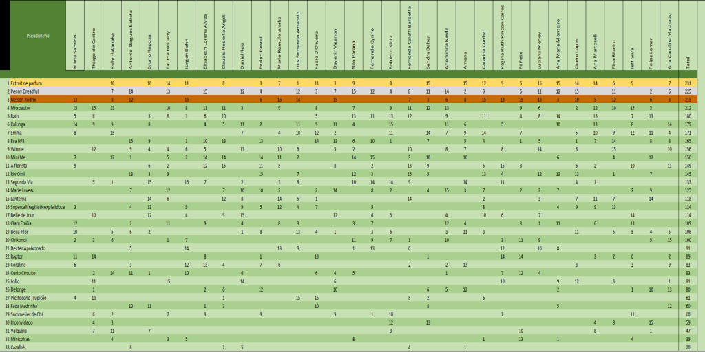 Abaixo vocês conferem a tabela de classificação geral, com as posições finais de todos os participantes e as notas que cada um atribuiu nas coleções de micros dos concorrentes, através da elaboração dos rankings avaliativos. Lembrando que é possível clicar na imagem para aumentá-la e facilitar a visualização.