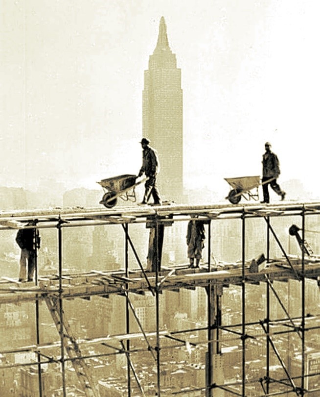 A sirene toca. 8:00, hora de pegar no pesado. Pelo elevador chega a argamassa e os tijolos. Erguer as paredes. O prumo corrige o desnível. Dói as costas encurvadas. O cimento corrói a ponta dos dedos. O cansaço desanima. Trabalha como zumbi. O cérebro corroído. Moído, na mó dos tempos.