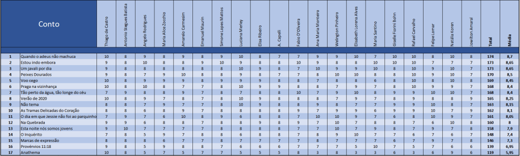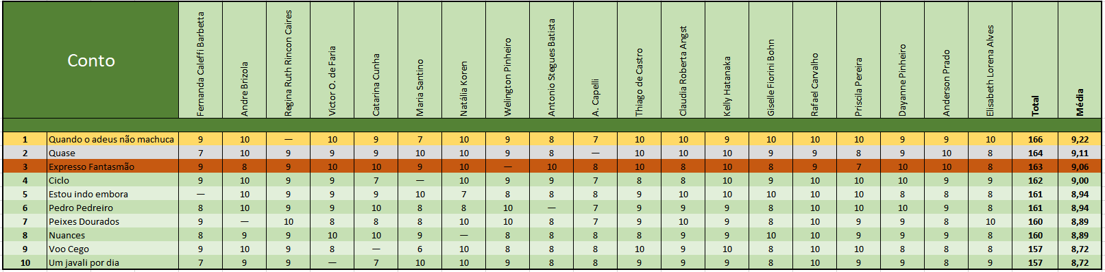E o grande campeão, com 166 pontos e 9,22 de média, é o intimista Quando o adeus não machuca, da sempre presente Regina Ruth Rincon Caires.