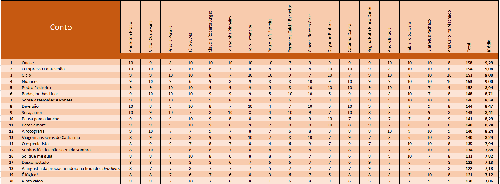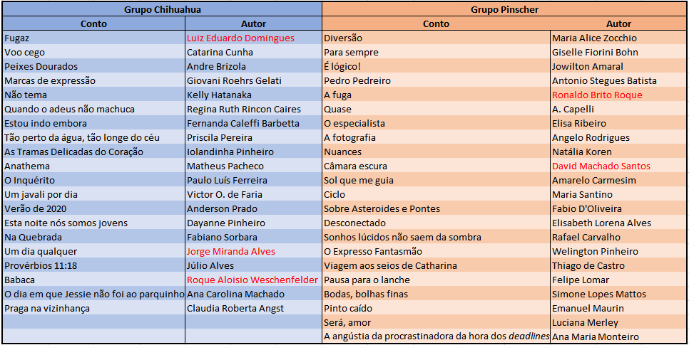 Chegamos ao fim de mais um desafio. A tabela abaixo revela as autorias dos contos de ambos os grupos (os nomes em vermelho são dos autores eliminados por não comentarem todos os contos):