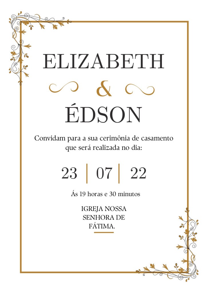 Outra coisa que preciso destacar. A imagem do meu conto é um convite de casamento da Elizabeth e do Édson. Não tem nada de casamento do Fabrício com a Elizabeth. Inclusive, eu tentei deixar destacado que Fabrício era padrinho do casamento do casal de amigos. Betina deveria ser a madrinha, mas pelas circunstâncias da vida, não o foi.