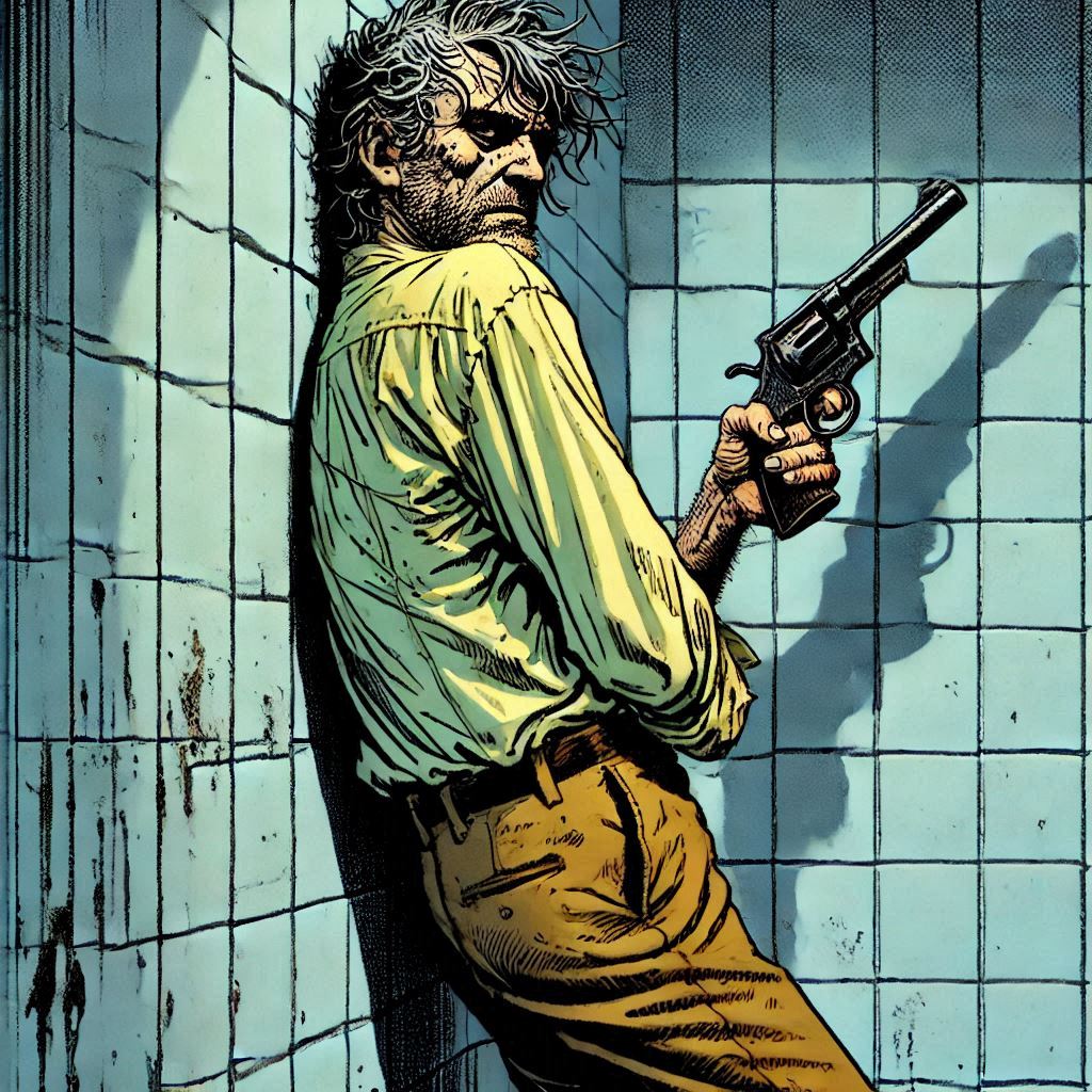 A imagem de um homem descabelado, lábios finos, olhar frio, encostado na parede, empunhando um revólver, mostra a figura de alguém costumado aos trampos da vida e a narrativa afirma isso mesmo, ele está marcado para morrer e espera o seu assassino. Conta com a reação de surpresa, mas não está muito certo que vai salvar-se desta vez. O conto parece ser parte de uma estória maior. Não tem reviravolta, é um pedaço de uma história que faltou ser contada. O que impressiona é a imagem.