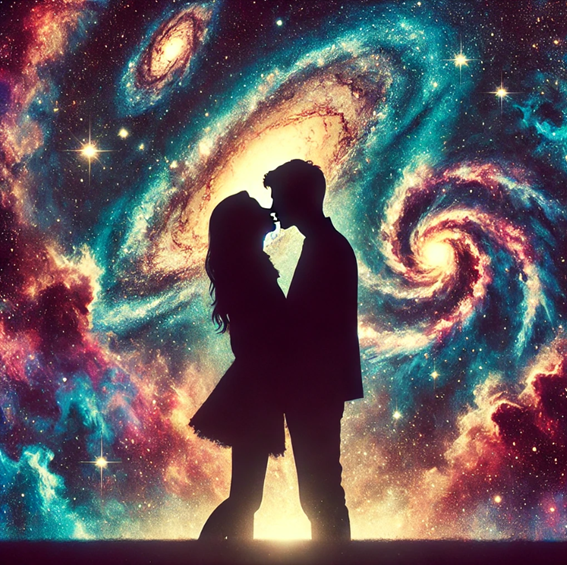 📜 Conteúdo (⭐⭐▫): casal apaixonado se beija e compara o beijo a vários eventos cósmicos. Uma releitura astronômica das borboletas no estômago.