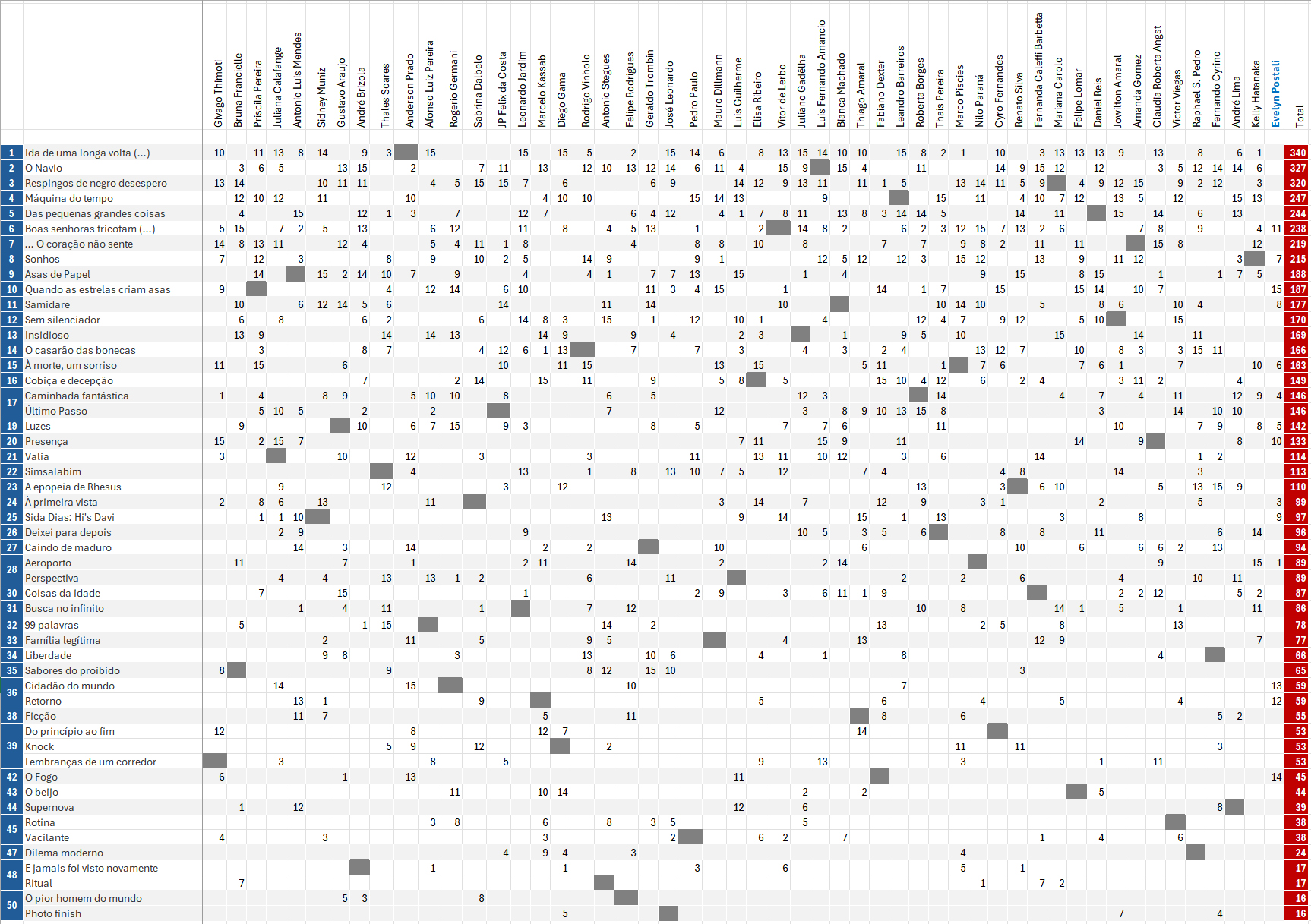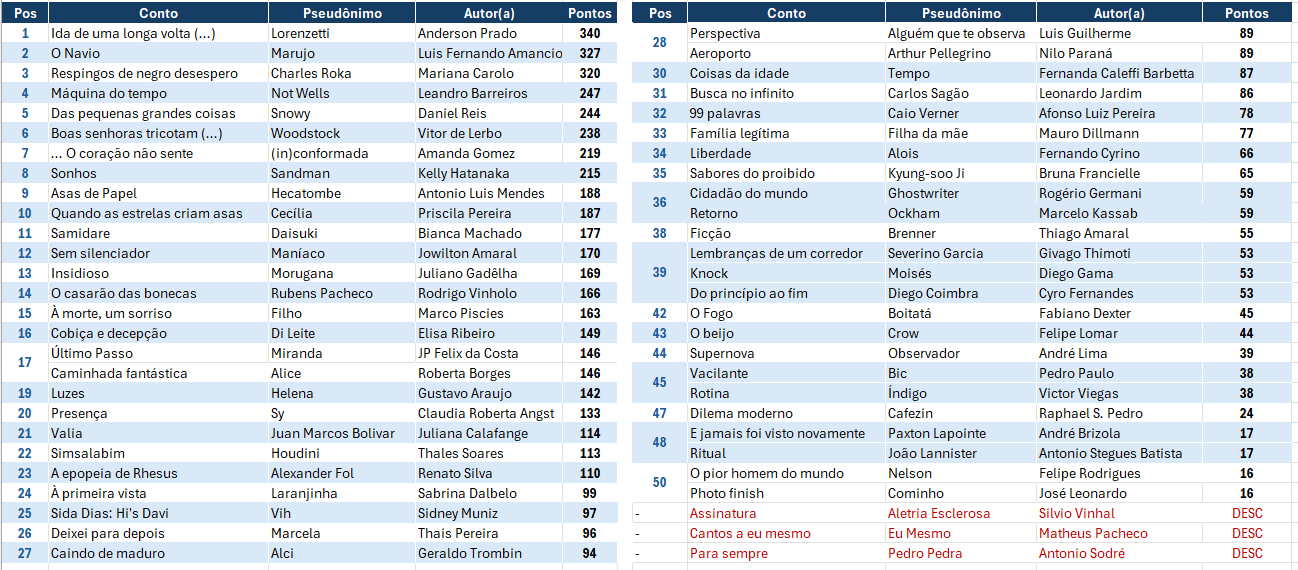 A tabela abaixo demonstra pontuação de todos os contos, nota a nota, assim como as autorias, desconsiderados os contos eliminados.