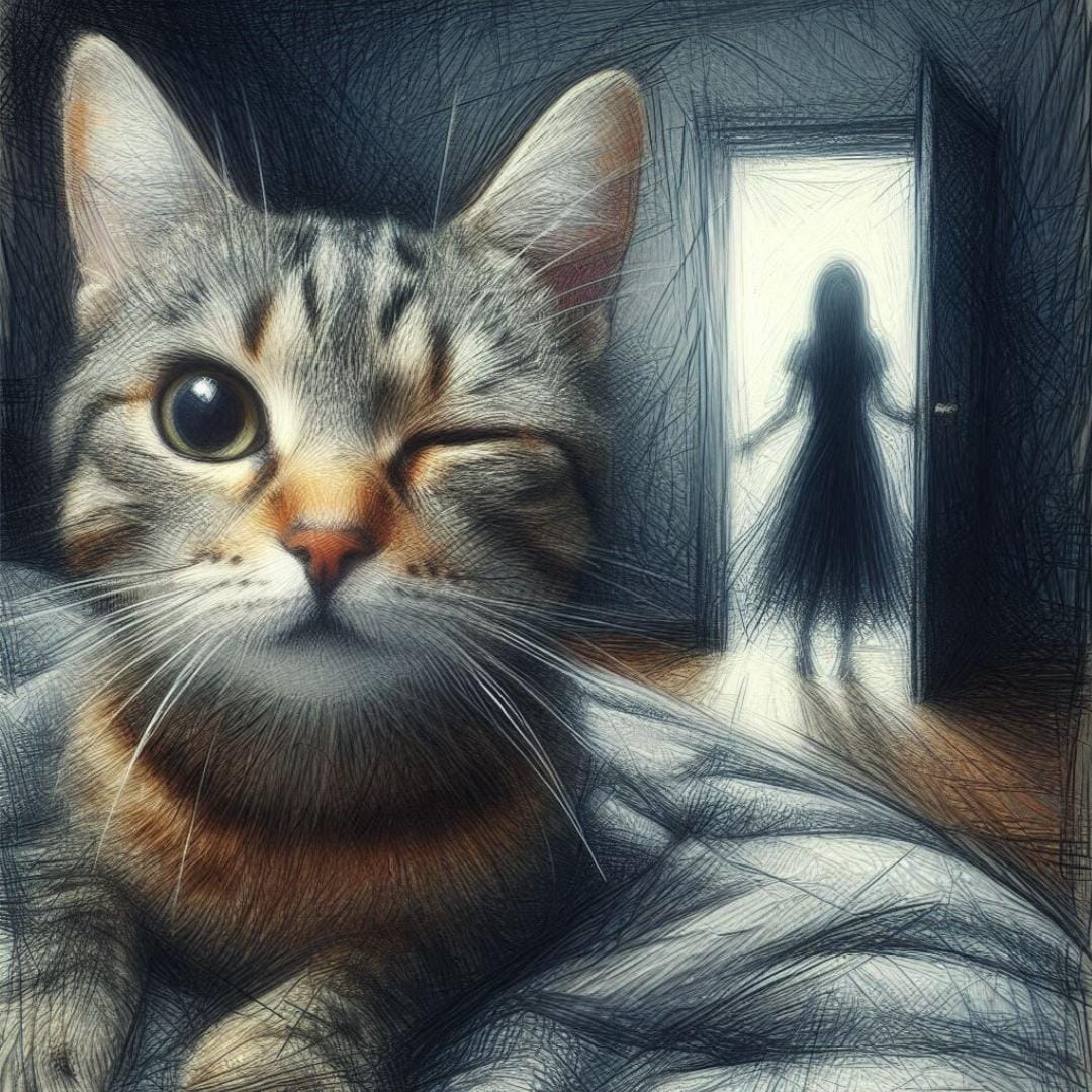 Ele desperta, como todos os dias, pouco depois do sol se pôr e mal havia se espreguiçado quando o espírito apareceu novamente, surgindo do banheiro e se posicionando embaixo do batente. Nestor deu uma pequena mordida na pata para garantir que não estava dormindo. Gatos podem até ser capazes de pensar ou sonhar, mas se beliscar ainda não. Ainda.