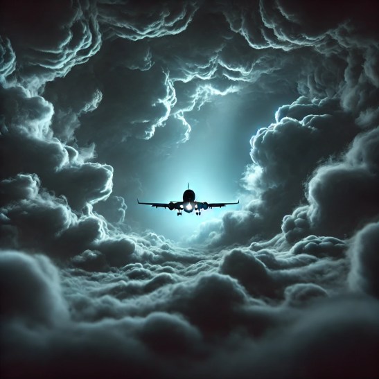 Ele esperou a aeromoça se afastar. Então, levantou-se discretamente, e com delicadeza, foi até a ponta da fileira em que estava sentado e abriu um filete da cortina da janela, esperando entrar alguma luz exterior. Mas nada iluminou a cabine, se não a fez mais escura. O espanto do homem foi tanto que, de supetão, abriu toda a cortina, revelando um profundo breu. Seu movimento brusco acabou por acordar a senhora da última poltrona.