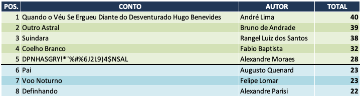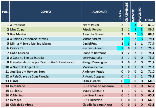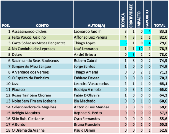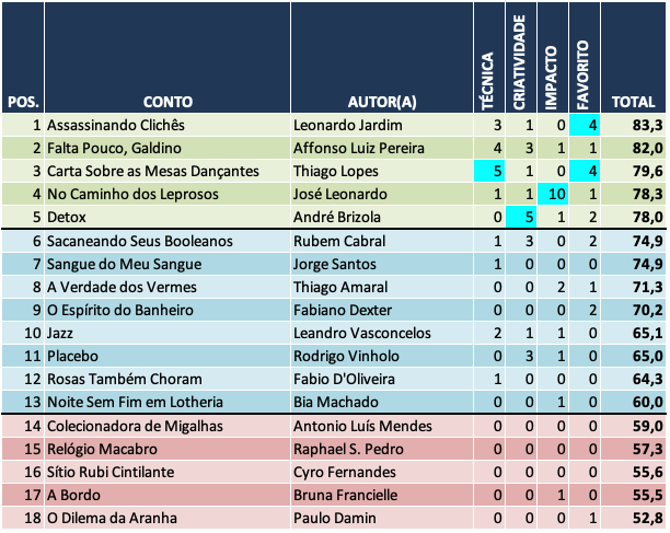 Já na zona de rebaixamento, tivemos: Antonio Luís Mendes, Raphael S. Pedro, Cyro Fernandes, Bruna Francielle e Paulo Damin. Esses 5 participantes disputarão a Série C na próxima rodada.