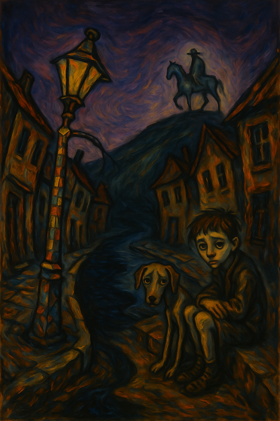 O cão Injuriado mordia os embebedados e tinha humor que variava. Mas era cão amigo das crianças, dos vadios e dos esfomeados, pois tinha fome e também vadiava, com aquela sua alma infante. Era lugar de muitas imagens, e as imagens de terracota, logo abaixo de um alpendre, me faziam companhia junto ao Cão Injuriado. E eu sentava no meio-fio, me entregava pro meu cão, pra pensar em mim mais velho, ali mesmo, ao lado das santas. Muitas vezes eu chorava, imaginando meus pecados que um dia haveria de cometer. Será que Deus perdoa quem não é criança mais? Afinal, ali vivia um suicida, um louco e um embriagado, que andavam com passos de quem tem perdão.