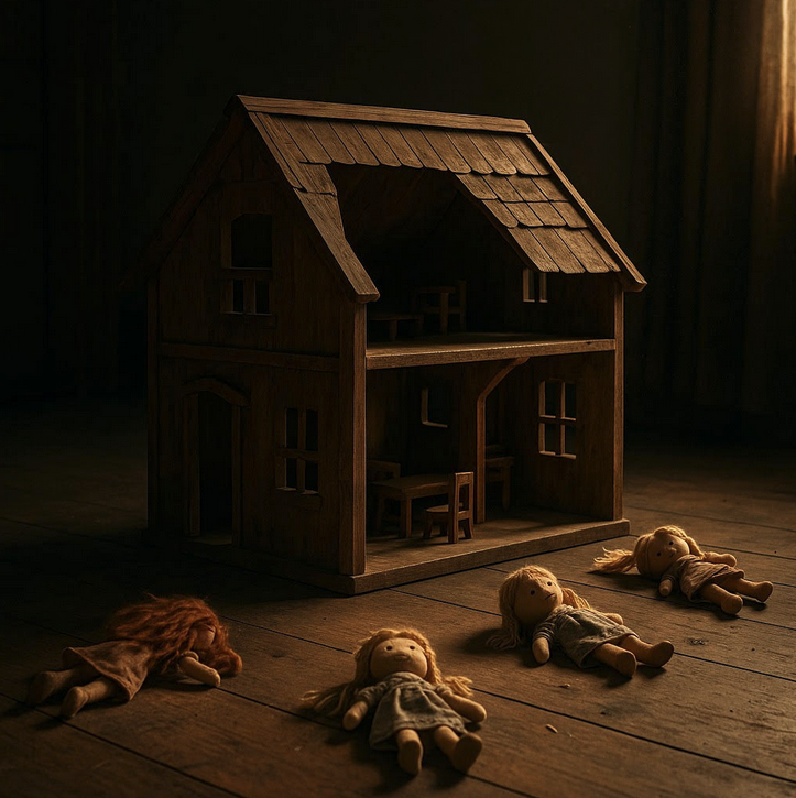Ouço um estrondo e corro para ver o que está acontecendo. Ele está destruindo a casa de bonecas com um martelo. Está enlouquecido, colocando tudo abaixo. Cada parede, cada móvel. Tudo virando  pó.