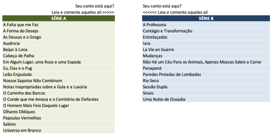 Conforme mostrado acima, os integrantes da Série A deverão ler, comentar e avaliar os 13 contos da Série B. Da mesma forma, os integrantes da Série B deverão ler, comentar e avaliar os 18 contos da Série A.