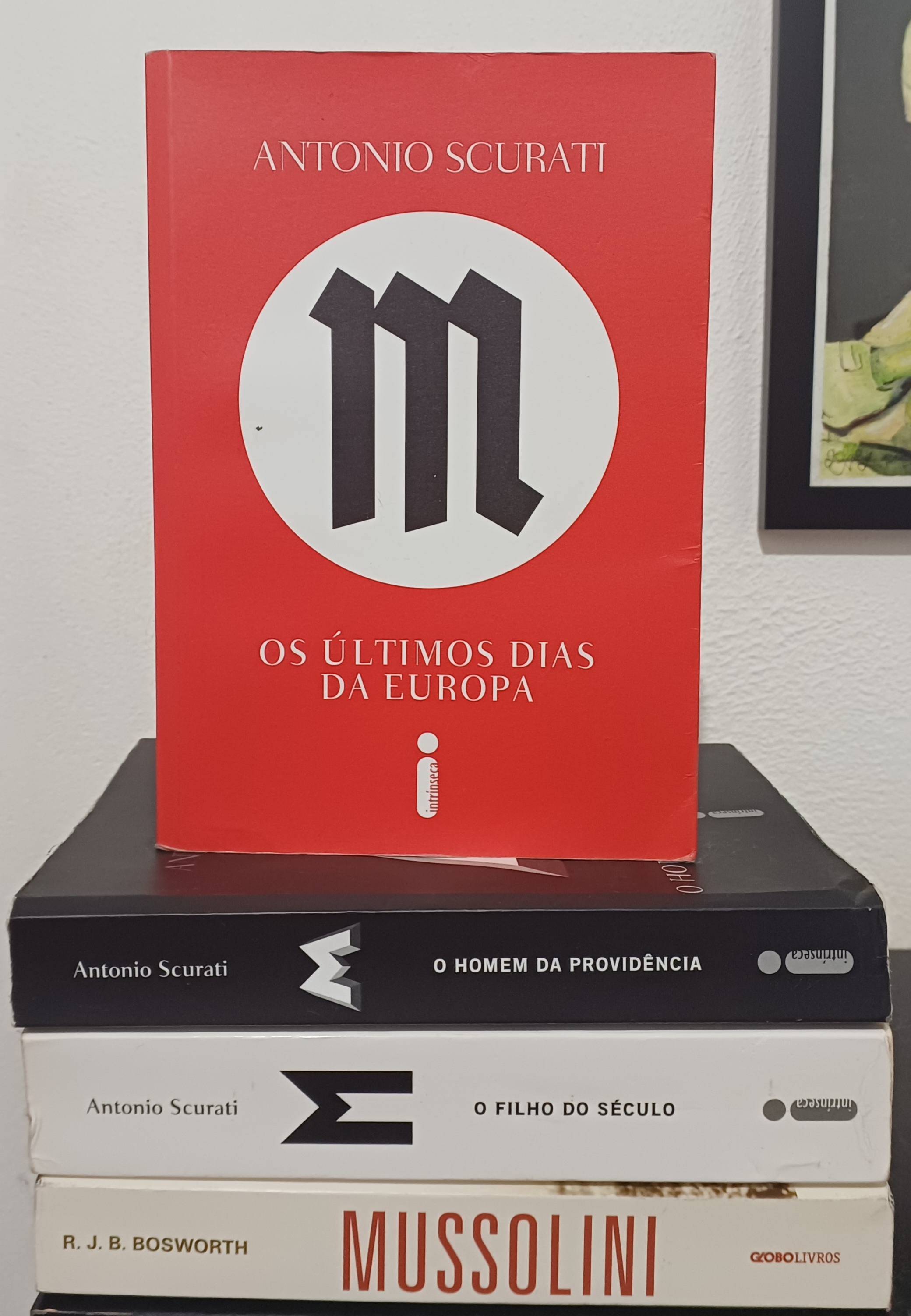 Acima, os três livros da série “M”, o terceiro em evidência. Na base, uma biografia do ditador italiano, inserida por mera estética temática desse registro. Um capricho deste autor.