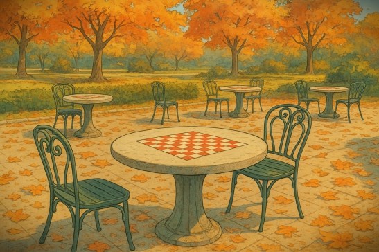Levantei cedo, o frio era exasperador. Munido de todo o aparato de inverno, marchei até o jardim antevendo o tabuleiro e as peças, já gravadas na memória. Mas, à distância, percebi algo errado. Um objeto deitado no tabuleiro. Meu adversário deitara seu rei? Tinha ele desistido?