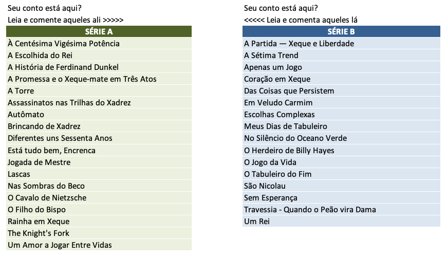 Conforme mostrado acima, os integrantes da Série A deverão ler, comentar e avaliar os 16 contos da Série B. Da mesma forma, os integrantes da Série B deverão ler, comentar e avaliar os 18 contos da Série A.
