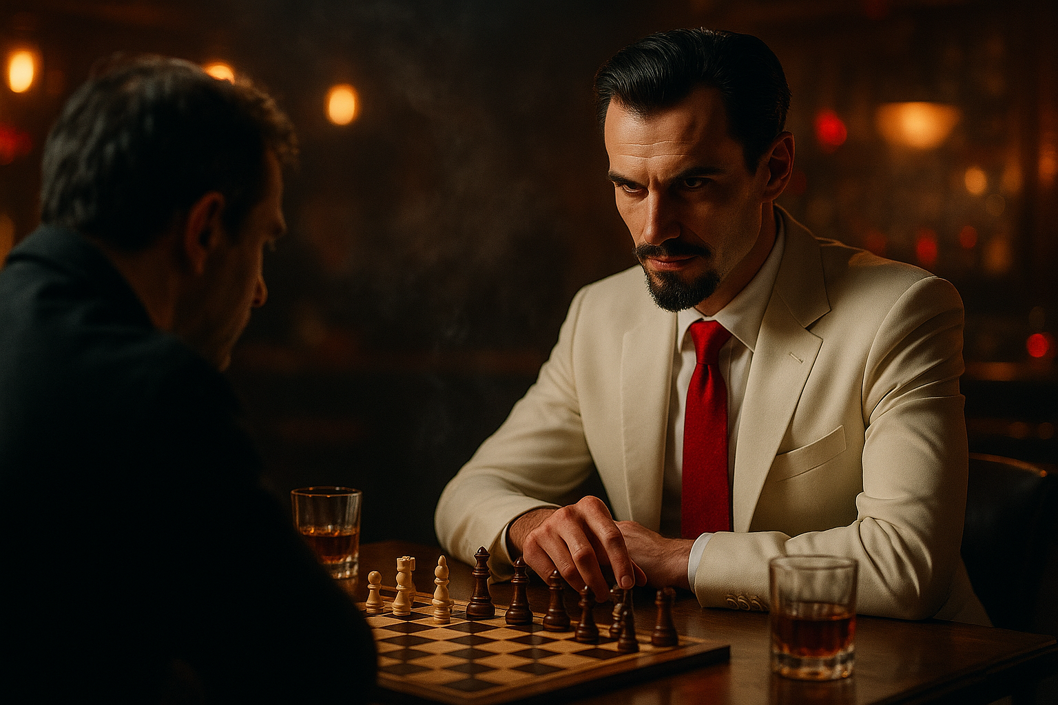 Gabriel ficou confuso e ameaçou falar alguma coisa. O homem sorriu. Destoava do restante do bar, tanto em elegância quanto em excentricidade. Vestia-se com um terno branco de gravata vermelha. O rosto delicadamente esculpido realçava o cavanhaque perfeitamente desenhado em sintonia com o longo bigode. As mãos seguravam um tabuleiro de xadrez.