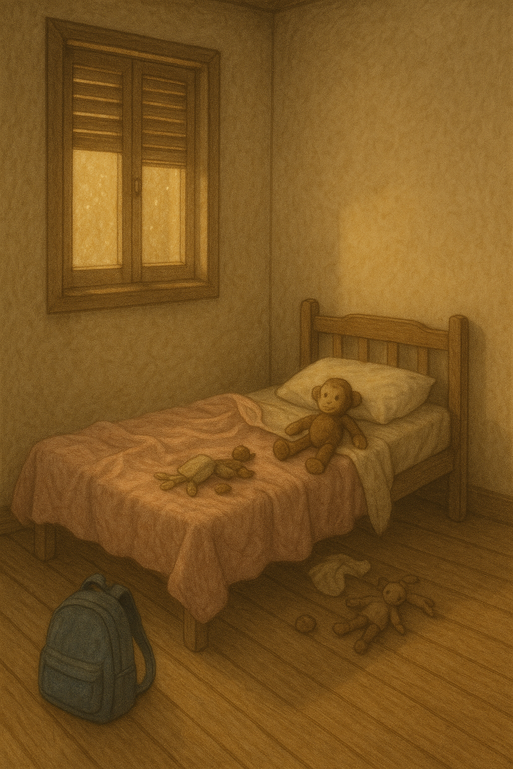 Ela não respondeu. Apenas guardou o caderno após marcar. Apagou a luz do quarto e abriu a porta. Ele pegou a mochila. A menina segurou a boneca. Saíram os três — devagar, sem muito som.