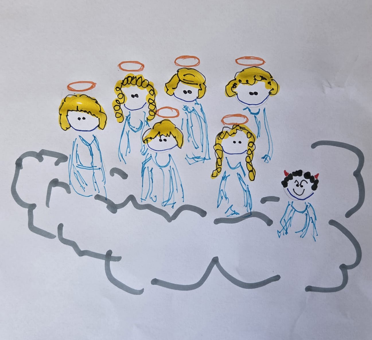 — Façam uma fila por hierarquia: Serafins, Querubins, Potestades — até os Anjos. Desorientado, o jovem demônio perguntou: — eu fico onde, Senhor?