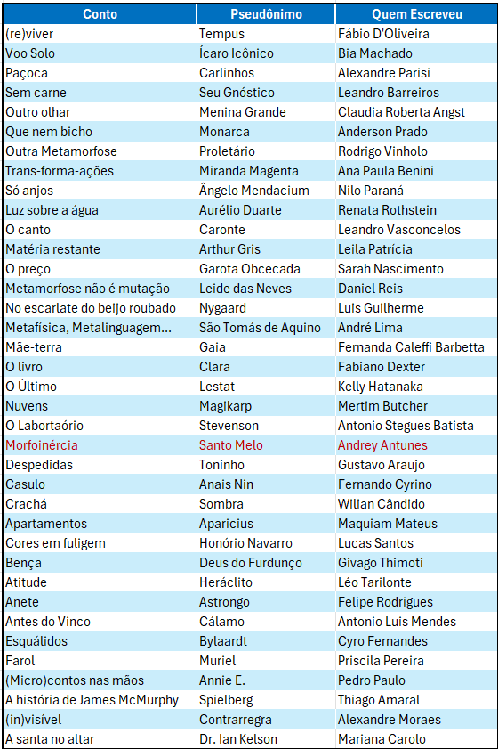 Primeiramente, vamos à revelação das autorias. A tabela a seguir contém os contos, os pseudônimos e os nomes das pessoas que escreveram: