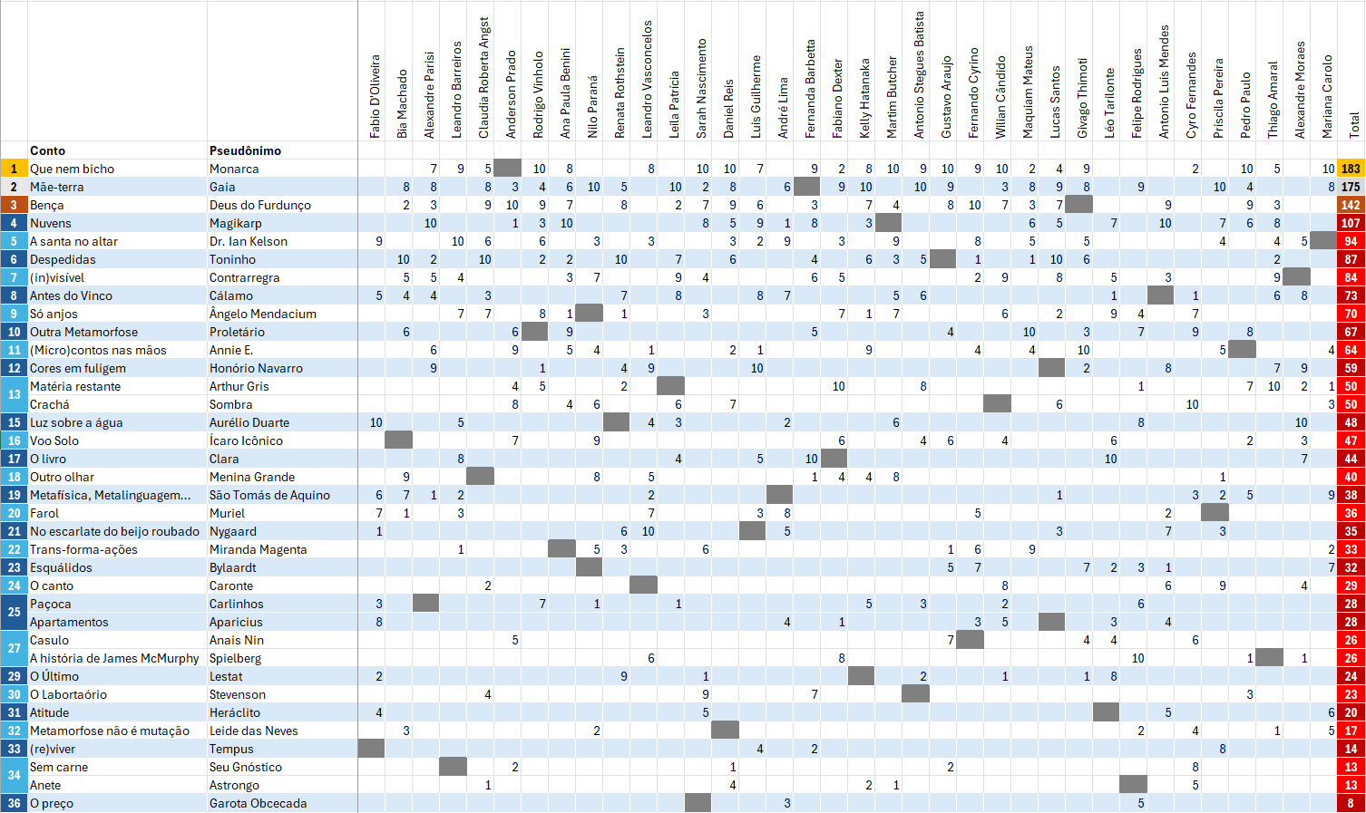 A tabela abaixo demonstra pontuação de todos os contos, nota a nota, assim como as autorias, desconsiderados os contos eliminados.